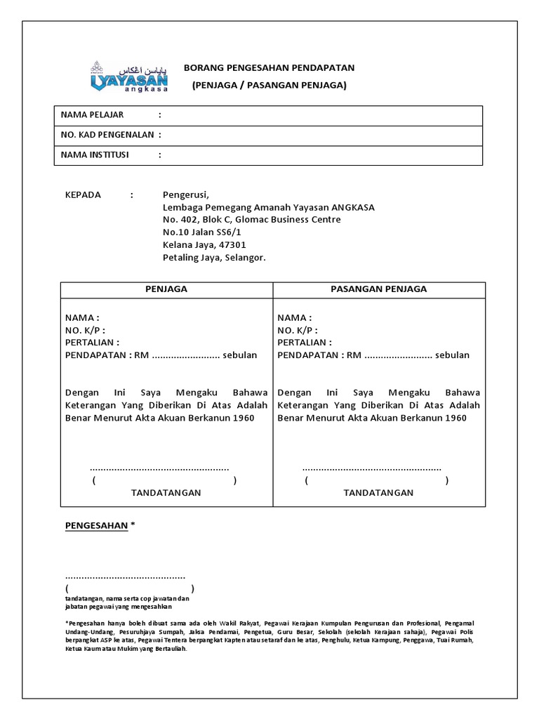Please copy and paste this embed script to where you want to embed. Yayasan perak, tingkat 1, wisma yayasan perak, no.111, jalan sultan idris shah, 30000 ipoh, perak. Savesave borang pengesahan pendapatan 2019.pdf for later. 0 ratings0% found this document useful (0 votes). Pengesahan pembayaran bnd $ 15.00 sahaja.