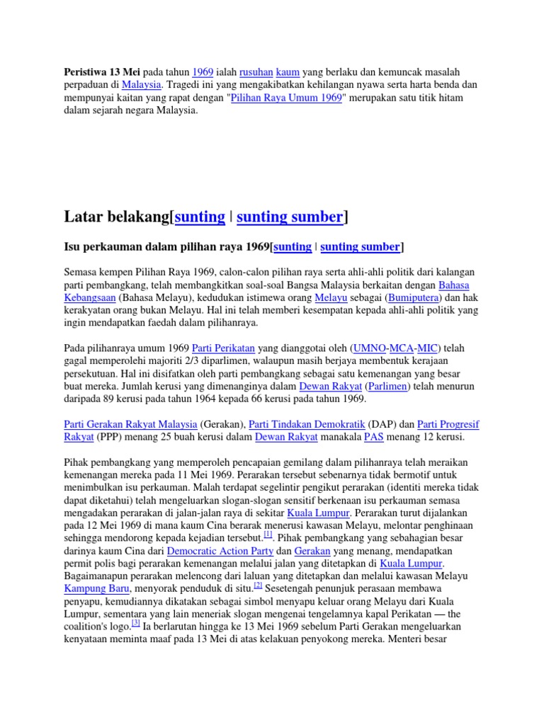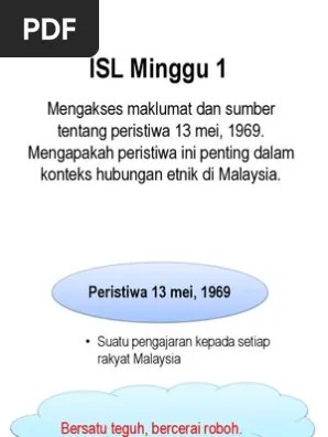 Peristiwa 13 mei 1969 merupakan sejarah hitam negara malaysia iaitu rusuhan kaum.rusuhan kaum yang berlaku pada tarikh tersebut merupakan kemuncak kepada masalah perpaduan di malaysia.peristiwa ini berkait rapat dengan pilihan raya umum 1969.semasa kempen pilihan raya. Buku dilema melayu (malay dilemma) oleh tun dr mahathir telah diharamkan. Peristiwa 13 mei 1969 merupakan kemuncak kemarahan lama orang melayu kerana mereka miskin di tanah air mereka sendiri. Tragedi ini yang mengakibatkan kehilangan nyawa serta harta benda dan mempunyai kaitan yang rapat dengan pilihan raya umum 1969 merupakan satu titik hitam dalam. Tragedi ini telah berlaku pada 13 mei 1969 sebaik sahaja selepas pilihan raya 1969 bertempat di kuala lumpur dan sekelilingnya sahaja(selangor). Pengenalan peristiwa 13 mei 1969 merupakan satu tragedi berdarah yang banyak meninggalkan kesan terhadap politik, ekonomi dan sosial masyarakat kronologi. Rusuhan kaum yang berlaku pada tahun 1969 adalah kemuncak masalah perpaduan di malaysia. Those who cannot remember the past are condemned to repeat it. Barisan nasional dibentuk.wilayah persekutuan kuala lumpur dibentuk bagi mengurangkan pengundi cina dalam dewan undangan negeri selangor. Peristiwa 13 mei 1969 menyebabkan tunku abdul rahman dipersalahkan oleh orang melayu dan malaysia secara keseluruhannya. So please help us by uploading 1 new document or like us to download Peristiwa 13 mei pada tahun 1969 adalah rusuhan kaum yang berlaku sebagai kemuncak masalah perpaduan di malaysia. Maklumat ini adalah berdasarkan rekod dan dokumen di pejabat rekod awam di london mengenai tragedi 13 mei yang.