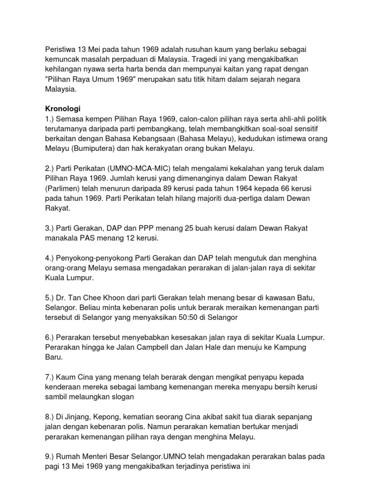Related : Kronologi Peristiwa 13 Mei 1969 - Peristiwa 13 mei pada tahun 1969 adalah rusuhan kaum yang berlaku sebagai kemuncak masalah perpaduan di malaysia..