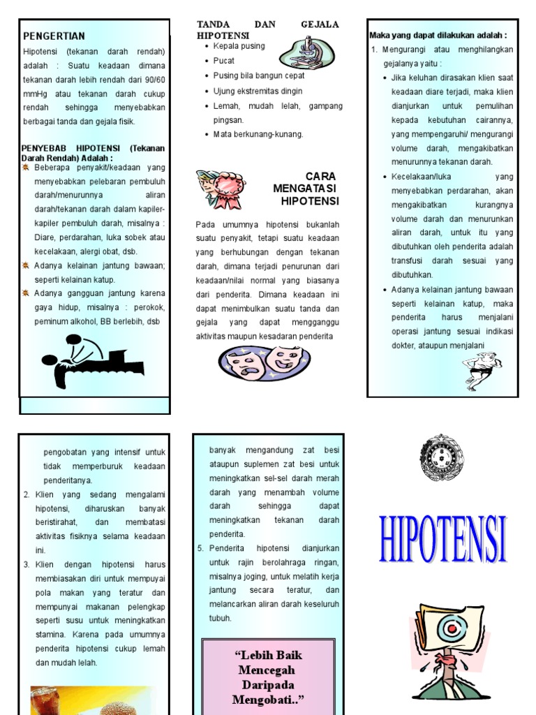 Tekanan darah rendah merupakan suatu keadaan dimana tekanan darah ada dibawah nilai normal tersebut. Karena banyak orang yang berpikiran bahwa hipotensi tidak terlalu membahayakan seperti hipertensi, maka penderita hipotensi pun cenderung meremehkan. Tak hanya tekanan darah tinggi, tekanan darah rendah juga bisa menjadi masalah serius bagi kesehatan. Tekanan darah rendah bisa memicu terjadinya stroke dan serangan jantung. Penting untuk mengurangi jumlah garam yang kamu makan. Padahal hipotensi yang dibiarkan mampu. Peningkatan ini menyebabkan jantung harus bekerja lebih keras dari biasanya untuk mengedarkan darah melalui pembuluh darah. Mematuhi anjuran dan pantangan beberapa tanda atau gejala darah rendah, meliputi pusing, tidak seimbang ketika berdiri, pandangan kabur, sulit berkonsentrasi, lemas, hingga mual dan muntah. Penyebab tekanan darah rendah adalah karena tubuh kekurangan folat dan vitamin b12 yang merupakan faktor risiko anemia serta dapat menyebabkan tekanan darah rendah. Atau sebaliknya, yaitu tekanan darah rendah (hipotensi) dengan tekanan di bawah 120/80 mmhg. Sebagian orang bilang hipotensi disebabkan karena belum sarapan pagi atau tidak makan seharian. Kebanyakan wanita mengalami tekanan darah rendah selama kehamilan, yang penyebabnya bisa dikaitkan dengan perubahan kardiovaskular selama kehamilan. Well, bisa jadi itu adalah tanda bahwa kamu mengidap penyakit tekanan darah rendah atau hipotensi.