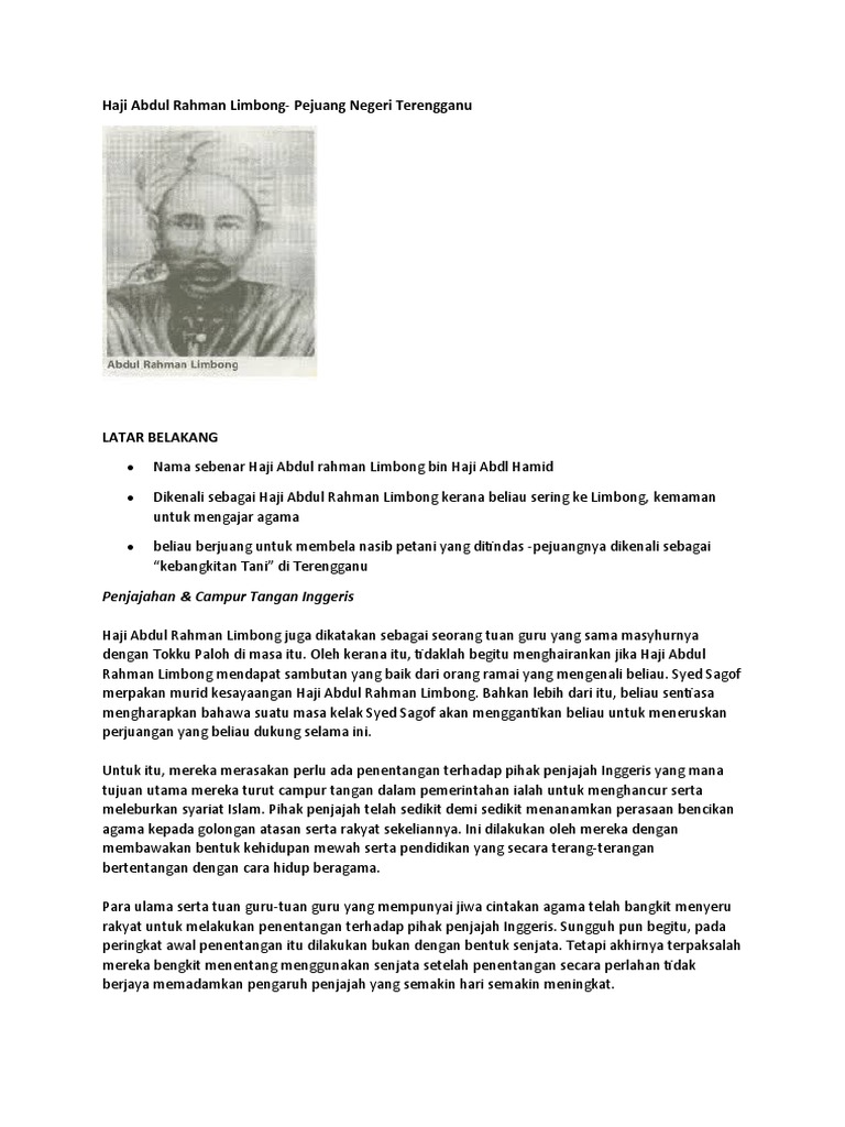 Dikenali sebagai haji abdul rahman limbong kerana beliau sering ke limbong, kemaman untuk mengajar agama. Nur asyikeen binti ishak nur dayana binti mohd zubir siti noorliyana binti kamarudin latar belakang nama sebenarnya ialah haji abdul rahman bin haji abdul hamid bin haji abdul qadir lahir tahun 1285 h/1868m meninggal dunia di mekah 1347 h/1929m. Lahir tahun 1285 h/1868m, meninggal dunia di mekah, 1347 h/1929m. Nama sebenar haji abdul rahman limbong bin haji abdl hamid. Membincangkan latarbelakang haji abdul rahman limbong serta sumbangan beliau dalam kebangkitan rakyat menentang penjajah di terengganu pada tahun 1928.